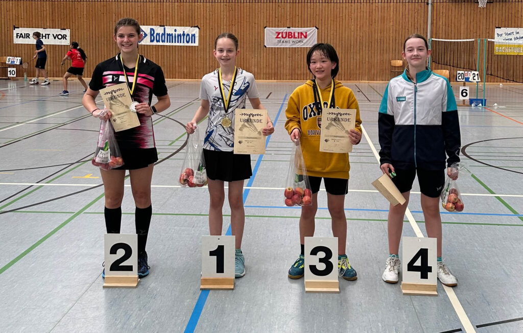 Die 12-jährige Marie Ullmann vom Badmintonclub Bodenwöhr konnte sich in allen drei Disziplinen den Titel holen! Mit ihren freystädter Partnern Elisa Herrler (im Mädchendoppel) und Lasse Wittmann (im Mixed) trat sie sogar eine Altersklasse höher, also U15 an. Ohne Satzverlust spielte sie sich jeweils ins Finale und freute sich riesig über das Triple.